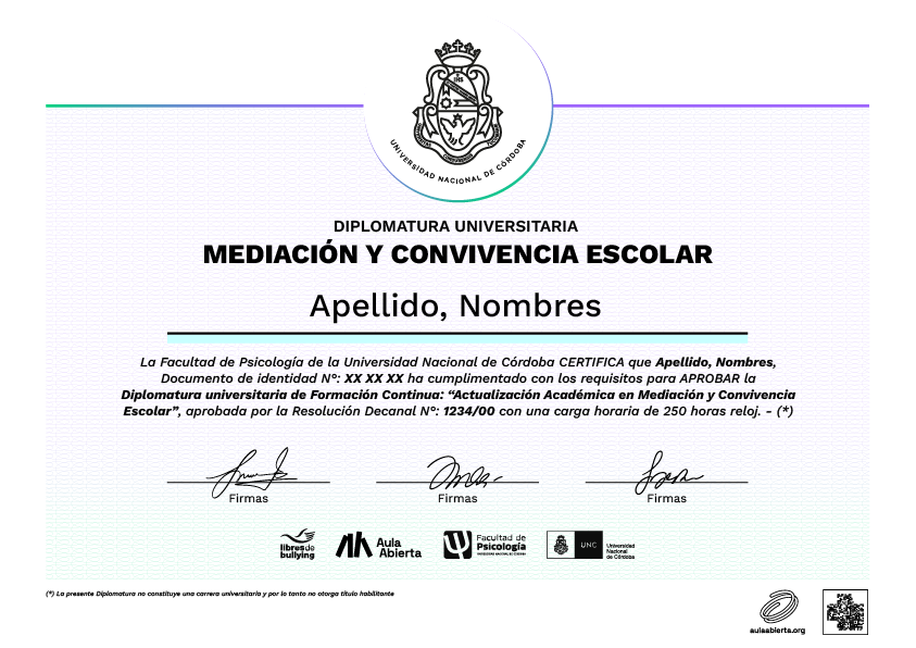 La Diplomatura es una capacitación de educación continua que por su carga horaria de 250 horas reloj, puede acreditar como “Actualización Académica”, de acuerdo con lo establecido en la Resolución CFE N.° 117/10 respecto de los postítulos docentes.